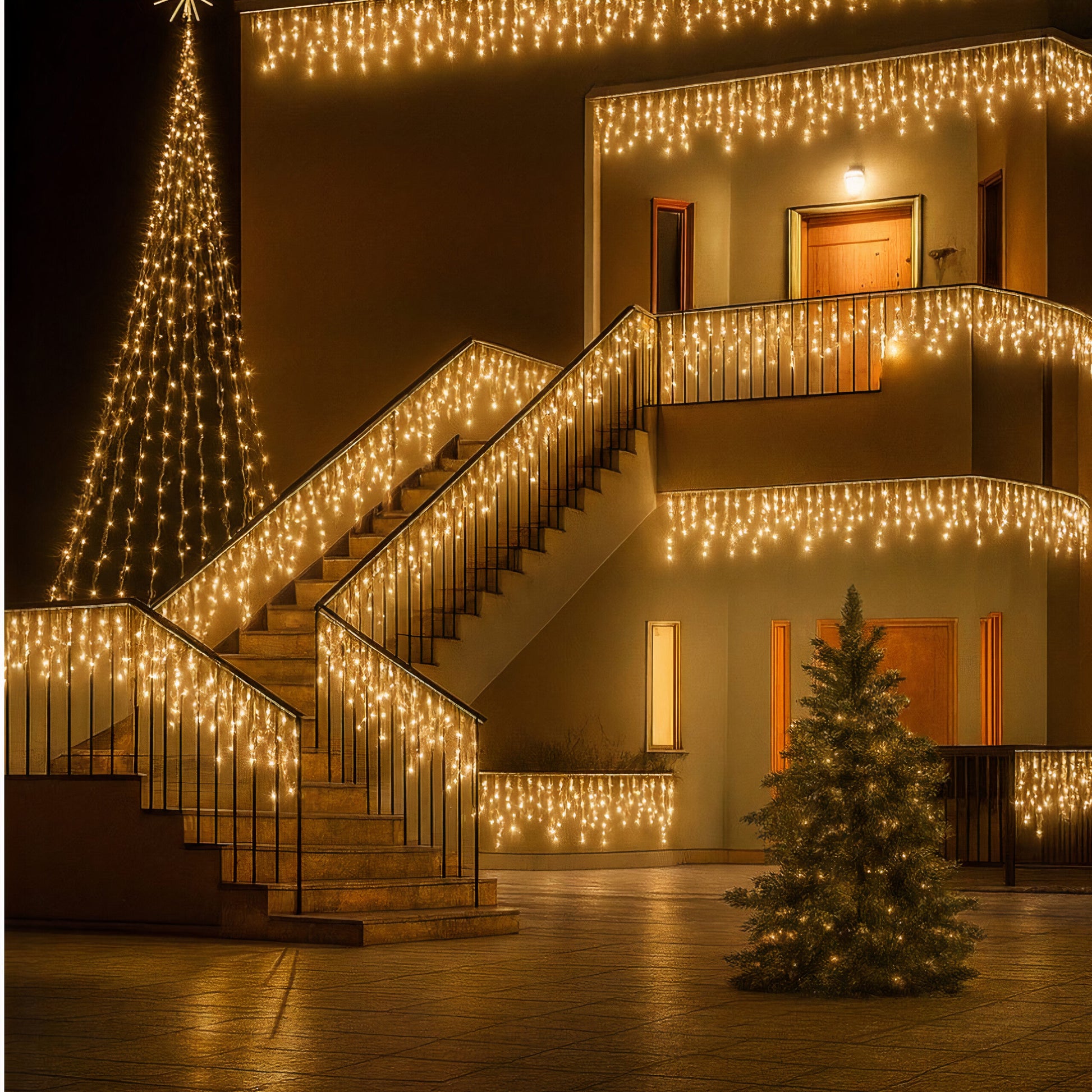 Lumina caldă a franjurilor se revarsă ca o ploaie blândă de sclipiri, aducând o atmosferă primitoare și festivă în orice spațiu. Creează acel aspect clasic de sărbătoare care transformă instant casa într-un loc mai cald, mai luminos și plin de farmec în serile de iarnă.